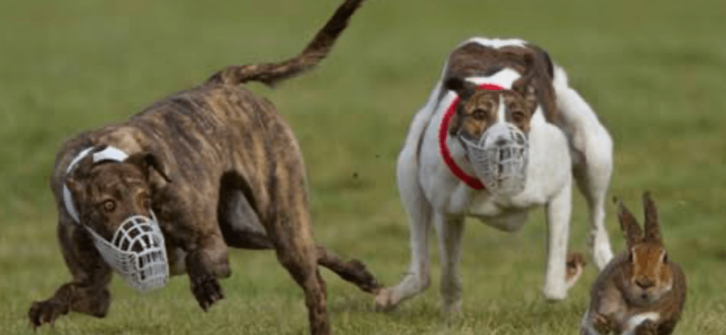 The dogs are muzzled in a 500 yard run the Hare is given a 100 yard start the hounds pursue ,Hare gets away in the escapes provided as the dogs catch up .